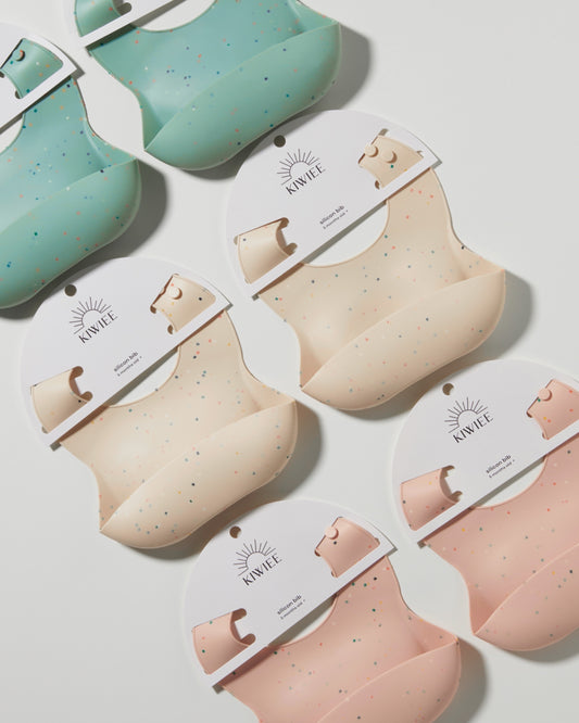 おしゃれなカラーとコンフェッティデザインで、毎日のお食事が楽しくなるシリコンスタイ。
